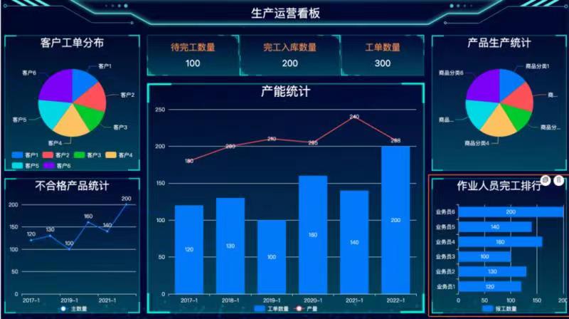 生產(chǎn)看板支持趨勢圖、餅圖、指標(biāo)卡、排行榜等多種可視化數(shù)據(jù)展示樣式,也預(yù)置了多套精美皮膚供選擇,自定義的看板可發(fā)布為菜單,單獨授權(quán)給老板、廠長、車間、庫管、品控等多用戶角色使用, 看板支持在大屏、電腦端、工控機、車間電視等多端展示。