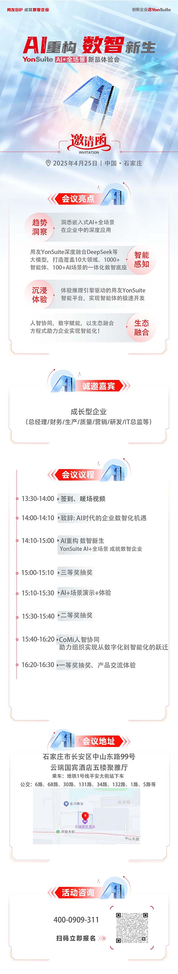免費(fèi)AI盛宴,智啟未來!4.25日云瑞國賓酒店-河北鴻圖YonSuite峰會(huì)免費(fèi)邀約