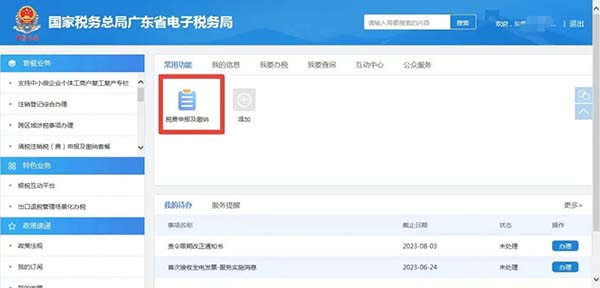 納稅人可登錄電子稅務(wù)局,點擊首頁左邊“常用功能—稅費申報及繳納”模塊,或點擊“我要辦稅—稅費申報及繳納”。