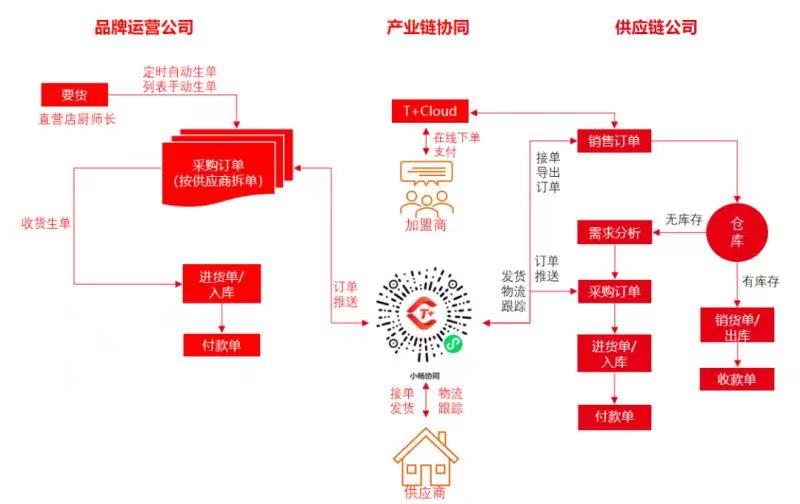 為了滿足餐飲門(mén)店要貨頻率高、時(shí)效性要求高的需求,遇江南在用友暢捷通T+Cloud的幫助下,應(yīng)用【智能供應(yīng)鏈】打通了“門(mén)店-供應(yīng)鏈公司-供應(yīng)商”三者之間的信息鏈路。