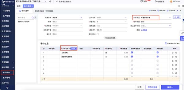 - 生產(chǎn)流程規(guī)范化:建立主要產(chǎn)品BOM(物料清單),使用生產(chǎn)加工單管理生產(chǎn)任務(wù)。對于集中領(lǐng)用的輔料,先通過調(diào)撥單調(diào)撥到生產(chǎn)車間倉,再根據(jù)生產(chǎn)加工單和BOM領(lǐng)料,確保成本核算更精準(zhǔn)。定期盤點生產(chǎn)車間倉,處理耗用差異,通過產(chǎn)成品入庫單核算入庫成本。