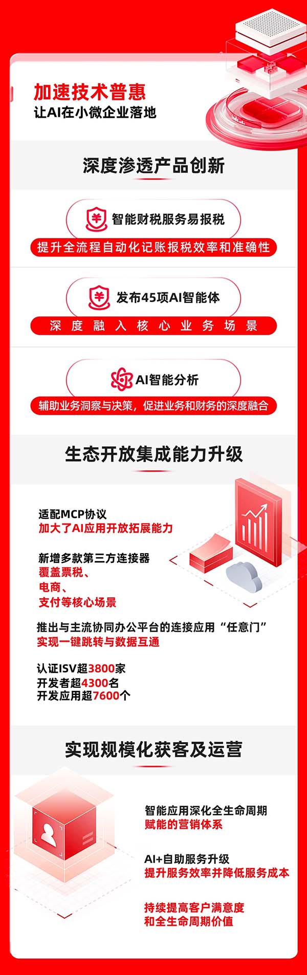 報(bào)告期內(nèi),暢捷通加速推動(dòng)AI技術(shù)在小微企業(yè)的深度落地,通過(guò)新一代企業(yè)級(jí)AI原生應(yīng)用開(kāi)發(fā)平臺(tái),不斷優(yōu)化產(chǎn)品體驗(yàn)與效能。為微型企業(yè)提供全流程智能化記賬報(bào)稅的智能財(cái)稅服務(wù)易報(bào)稅,借助于AI技術(shù)的發(fā)展和對(duì)財(cái)稅垂直大模型的持續(xù)訓(xùn)練,效率及準(zhǔn)確性進(jìn)一步提升,同時(shí)開(kāi)啟高效業(yè)務(wù)拓展模式,為該業(yè)務(wù)的規(guī)?;茝V打下堅(jiān)實(shí)基礎(chǔ)。暢捷通還發(fā)布了45項(xiàng)AI智能體應(yīng)用,覆蓋多條產(chǎn)品線,深度融入核心業(yè)務(wù)場(chǎng)景,全方位提升企業(yè)經(jīng)營(yíng)效率。