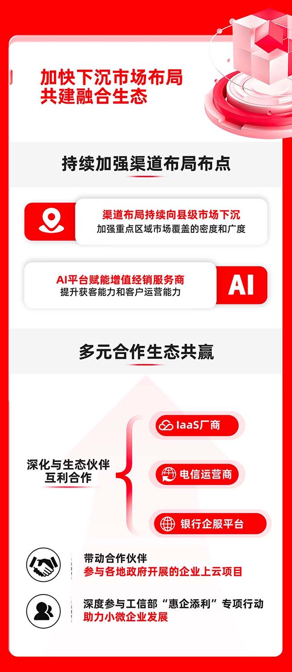 與此同時(shí),暢捷通深化與電信運(yùn)營(yíng)商、華為云等IaaS廠商、銀行企服平臺(tái)的互利合作,形成資源互補(bǔ)、場(chǎng)景互通的生態(tài)合作網(wǎng)絡(luò)。