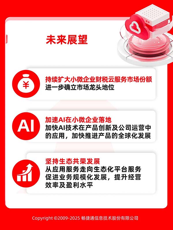 未來(lái),暢捷通將持續(xù)擴(kuò)大小微企業(yè)財(cái)稅云服務(wù)市場(chǎng)份額,進(jìn)一步鞏固小微企業(yè)財(cái)稅云服務(wù)市場(chǎng)龍頭地位,搶占小微企業(yè)云服務(wù)市場(chǎng)龍頭地位,堅(jiān)定秉持客戶成功原則,持續(xù)提升產(chǎn)品競(jìng)爭(zhēng)力,加快推進(jìn)產(chǎn)品的全球化發(fā)展。與此同時(shí),暢捷通將加速AI在小微企業(yè)落地,加快AI技術(shù)在產(chǎn)品創(chuàng)新及公司運(yùn)營(yíng)中的應(yīng)用,堅(jiān)持生態(tài)共榮發(fā)展,從應(yīng)用服務(wù)走向生態(tài)化平臺(tái)服務(wù),促進(jìn)業(yè)務(wù)規(guī)模化發(fā)展,提升經(jīng)營(yíng)效率及盈利水平。