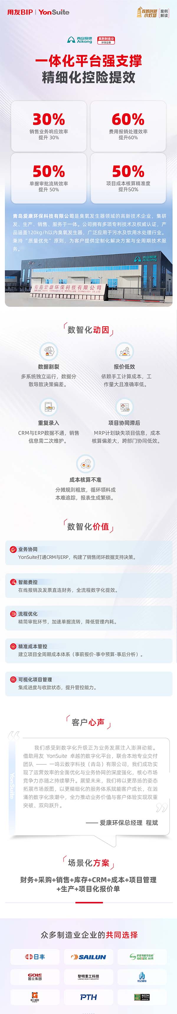 “臭氧發(fā)生器的核心是‘精準(zhǔn)’—— 精準(zhǔn)的臭氧濃度、精準(zhǔn)的反應(yīng)時(shí)間,才能保證水質(zhì)安全。企業(yè)管理也是如此,只有精準(zhǔn)的成本管控、高效的協(xié)同效率,才能支撐企業(yè)持續(xù)發(fā)展。” 愛康環(huán)保總經(jīng)理程斌在談及轉(zhuǎn)型時(shí)感慨道,“YonSuite 為我們注入了‘精準(zhǔn)基因’,讓成本可量化、流程可追蹤、決策有依據(jù)。未來,我們將以更精細(xì)化的管理和更可靠的產(chǎn)品,讓每一臺(tái)臭氧發(fā)生器都成為客戶信賴的‘水質(zhì)衛(wèi)士’。”