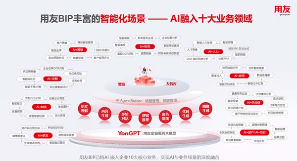 用友企業(yè)服務(wù)大模型YonGPT作為業(yè)界首個(gè)企業(yè)服務(wù)大模型,它融合了企業(yè)各個(gè)領(lǐng)域?qū)I(yè)知識(shí)和各類行業(yè)商業(yè)KnowHow,經(jīng)過(guò)領(lǐng)域、行業(yè)數(shù)據(jù)的預(yù)訓(xùn)練和精調(diào)的企業(yè)應(yīng)用服務(wù)的大模型,結(jié)合了用友在企業(yè)服務(wù)領(lǐng)域的經(jīng)驗(yàn)積累、領(lǐng)先并場(chǎng)景豐富的企業(yè)應(yīng)用軟件產(chǎn)品、大規(guī)模企業(yè)客戶基礎(chǔ)的優(yōu)勢(shì),能夠理解、解析各類企業(yè)數(shù)據(jù),應(yīng)用于各類業(yè)務(wù)場(chǎng)景。其面向復(fù)雜的行業(yè)應(yīng)用場(chǎng)景, 通過(guò)對(duì)行業(yè)模型精調(diào)幫助企業(yè)實(shí)現(xiàn)智能化的業(yè)務(wù)運(yùn)營(yíng)、自然化的人機(jī)交互、智慧化的知識(shí)生成、語(yǔ)義化的應(yīng)用生成四大能力,為企業(yè)提供智能化的人機(jī)協(xié)作、業(yè)務(wù)洞察、商業(yè)決策支持和智能運(yùn)營(yíng)服務(wù),是深懂業(yè)務(wù)的大模型,已完全融入到企業(yè)的“研供產(chǎn)銷服、人財(cái)物客項(xiàng)”業(yè)務(wù)與管理場(chǎng)景中。