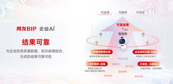 在結(jié)果可靠層面,用友BIP將大模 型的 “泛化能力”、小模型的 “場(chǎng)景智能”、高質(zhì)量數(shù)據(jù)的 “決策智能”、知識(shí)庫(kù)的 “專業(yè)知識(shí)” 深度融合,共同實(shí)現(xiàn)企業(yè)AI結(jié)果可靠。