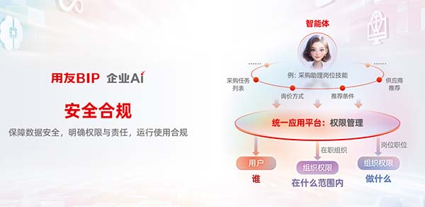 在安全合規(guī)層面,用友BIP通過(guò)保障企業(yè)的數(shù)據(jù)安全,對(duì)用戶明確權(quán)限與責(zé)任,規(guī)范AI應(yīng)用在企業(yè)內(nèi)的使用流程等,保證AI使用符合企業(yè)和國(guó)家的相關(guān)法規(guī)。通過(guò)接入企業(yè)權(quán)限管理與制度體系,通過(guò)針對(duì)異構(gòu)系統(tǒng)的技能權(quán)限管理(包括智能體的權(quán)限控制),以及數(shù)據(jù)倉(cāng)庫(kù)的分層權(quán)限控制、加密與脫敏以及訪問(wèn)通道等,并從技術(shù)架構(gòu)設(shè)計(jì)層進(jìn)行實(shí)時(shí)行為監(jiān)控、保障安全,以及遵從相關(guān)的倫理合規(guī)等。