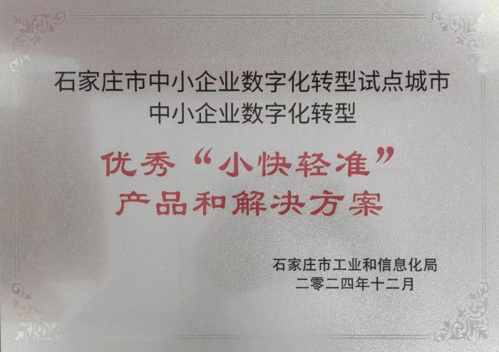 而在2024年,河北鴻圖偉創(chuàng)更是榮獲了石家莊市中小企業(yè)數(shù)字化轉(zhuǎn)型試點(diǎn)城市中小企業(yè)數(shù)字化轉(zhuǎn)型優(yōu)秀“小快輕準(zhǔn)”產(chǎn)品和解決方案的稱號(hào)。這一榮譽(yù)的獲得,充分體現(xiàn)了石家莊市工業(yè)和信息化局對(duì)河北鴻圖偉創(chuàng)在數(shù)字化轉(zhuǎn)型服務(wù)方面的高度認(rèn)可。石家莊市作為中小企業(yè)數(shù)字化轉(zhuǎn)型試點(diǎn)城市,一直在積極探索和實(shí)踐中小企業(yè)數(shù)字化轉(zhuǎn)型的有效路徑。河北鴻圖偉創(chuàng)的優(yōu)秀“小快輕準(zhǔn)”產(chǎn)品和解決方案,為石家莊市中小企業(yè)數(shù)字化轉(zhuǎn)型提供了有力的支持,也為其他地區(qū)提供了可借鑒的經(jīng)驗(yàn)和模式。