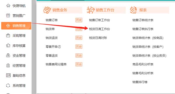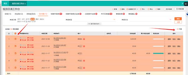 1、點(diǎn)擊【銷售管理】-【錢貨日清工作臺(tái)】-【待開票】,在表頭篩選下要開票的客戶名稱。