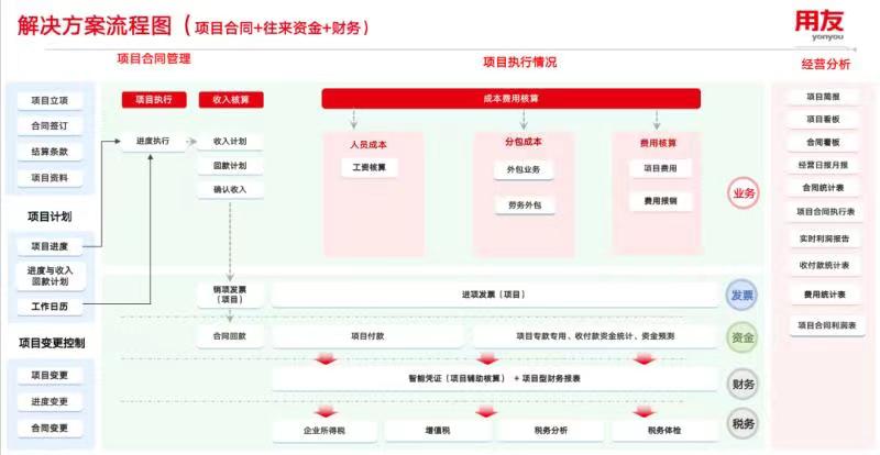 在系統(tǒng)里,通過項目進度在線填報、計劃高效協(xié)同、項目工時管理、在線審批、項目變更過程管理、項目進度與結算回款一體化、項目執(zhí)行過程中涉及的人員、費用、分包成本按項目歸集核算、業(yè)財數(shù)據(jù)分析一體化、業(yè)票財稅一體化、實時化、自動化,幫助項目會計、企業(yè)高管老板,降本增效。