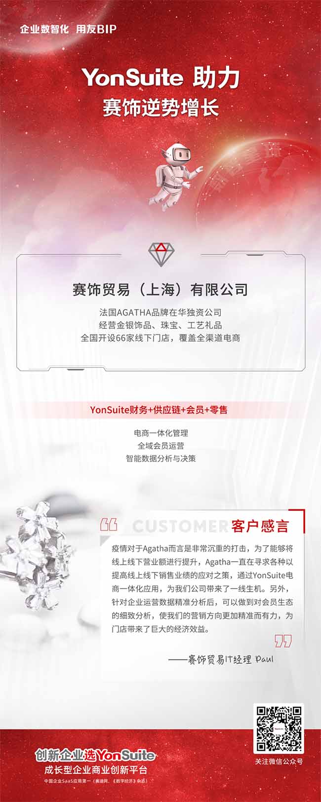 賽飾貿(mào)易(上海)有限公司是由法國(guó) AGATHA 品牌在中國(guó)成立的獨(dú)資公司,經(jīng)營(yíng)范圍包括金銀飾品、珠寶(毛鉆、裸鉆除外)、工藝禮品(文物除外)等,全國(guó)共開設(shè)了 66 家線下門店,并且各大電商平臺(tái)都有相應(yīng)旗艦店鋪。從成立至今在國(guó)內(nèi)累積了大批忠誠(chéng)用戶,會(huì)員量超過三十多萬。
