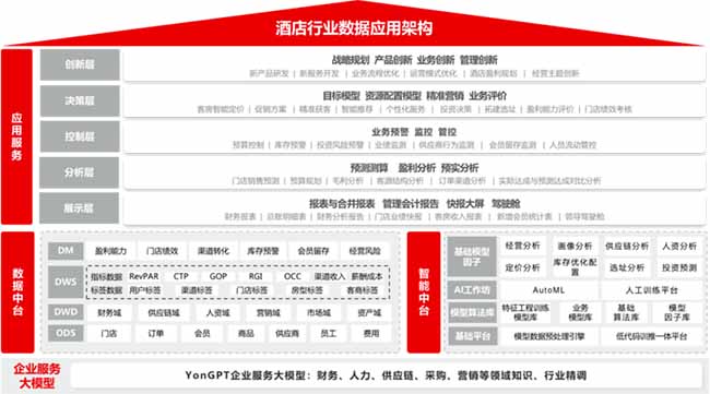 以YonGPT企業(yè)大模型為支撐,通過用友iuap數(shù)據(jù)中臺(tái)對(duì)酒店企業(yè)的人、財(cái)、經(jīng)營(yíng)、營(yíng)銷、資產(chǎn)、供應(yīng)鏈等多元業(yè)務(wù)數(shù)據(jù)進(jìn)行匯聚和治理,并圍繞核心業(yè)務(wù)線的經(jīng)營(yíng)、管理、會(huì)員、運(yùn)營(yíng)等重要指標(biāo)構(gòu)建分析體系,利用智能中臺(tái)的模型算法庫(kù)訓(xùn)練、構(gòu)建的酒店行業(yè)模型因子,為酒店企業(yè)提供5層全面數(shù)據(jù)服務(wù),深入洞察企業(yè)運(yùn)營(yíng)、識(shí)別潛在的業(yè)務(wù)風(fēng)險(xiǎn)和機(jī)會(huì),并提供智能化的解決方案,從而提高經(jīng)營(yíng)決策水平和業(yè)務(wù)運(yùn)營(yíng)效率。