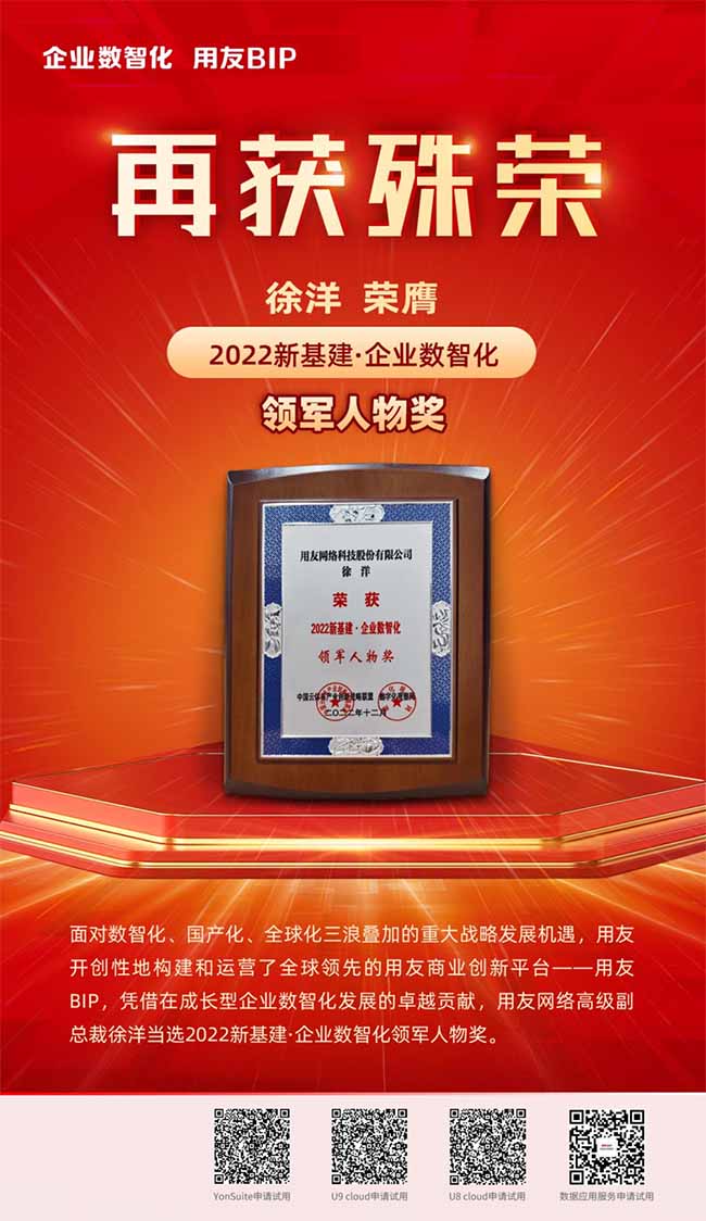 今年1月,國務院印發(fā)的《“十四五”數(shù)字經(jīng)濟發(fā)展規(guī)劃》明確提出,到2025年,數(shù)字經(jīng)濟核心產(chǎn)業(yè)增加值占國內(nèi)生產(chǎn)總值比重達到10%;展望2035年,力爭形成統(tǒng)一公平、競爭有序、成熟完備的數(shù)字經(jīng)濟現(xiàn)代市場體系,數(shù)字經(jīng)濟發(fā)展水平位居世界前列。依托國家政策紅利,面對數(shù)智化、國產(chǎn)化、全球化三浪疊加的重大戰(zhàn)略發(fā)展機遇,用友開創(chuàng)性地構建和運營了全球領先的用友商業(yè)創(chuàng)新平臺——用友BIP,憑借在成長型企業(yè)數(shù)智化發(fā)展的卓越貢獻,用友網(wǎng)絡高級副總裁徐洋當選2022新基建·企業(yè)數(shù)智化領軍人物獎。