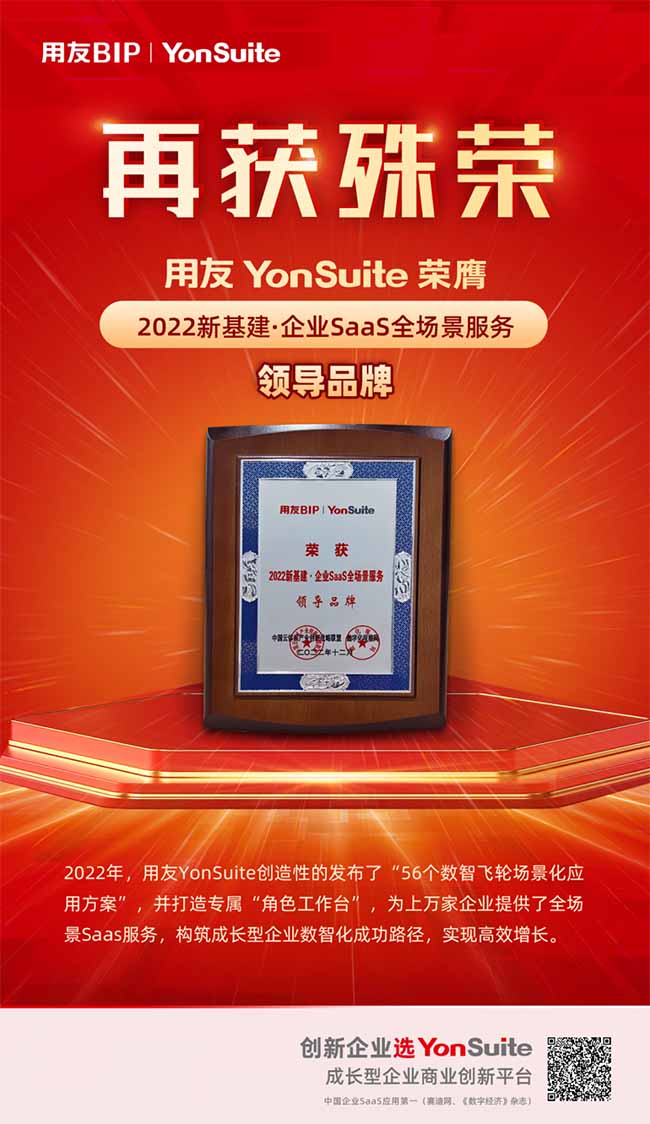 本次評選用友YonSuite榮獲“2022新基建·企業(yè)SaaS全場景服務領導品牌”,以實力引領創(chuàng)新,以技術領先性和創(chuàng)新性驅動企業(yè)高效增長,領跑中國SaaS產(chǎn)業(yè)發(fā)展。