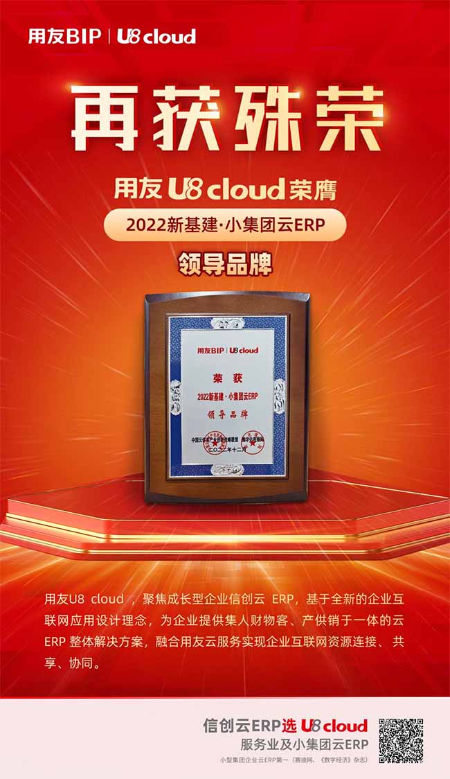 用友U8 cloud榮獲“2022新基建·小集團云ERP領導品牌”,在信創(chuàng)云ERP集團管控場景領域深耕,為成長型企業(yè)提供集團管控全場景解決方案,安全可信、按需部署、快速見效;U8 cloud 以助力企業(yè)業(yè)務創(chuàng)新和管理變革為己任,推動企業(yè)敏經(jīng)營、輕管理、簡 IT,幫助成長型企業(yè)重塑新的商業(yè)模式,賦能成長型企業(yè)高速發(fā)展、云化創(chuàng)新。