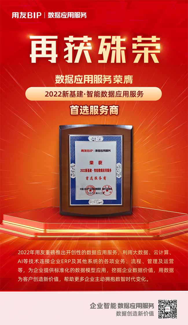 用友數(shù)據(jù)應用服務憑借著先進的技術架構、創(chuàng)新的應用模式和優(yōu)秀的客戶實踐,榮獲“2022新基建·智能數(shù)據(jù)應用服務首選服務商”獎項。
